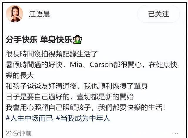 江语晨也是一样,曾经的“优乐美女孩”在婚姻里竟然如此不被珍惜,没有保姆、没有育儿嫂,俩孩子全靠她照顾,丈夫还常年不回家。 这样的婚姻,不要也罢。于是9年后,江语晨大方的官宣离婚。她说:分手快乐!单身快乐!语气轻柔的还像是当年说着“原来我是奶茶”的那个女孩子,充满着甜腻腻的味道。