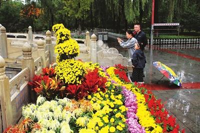 学府公园花团锦簇,游客在秋雨中赏花拍照。张澍宏 摄